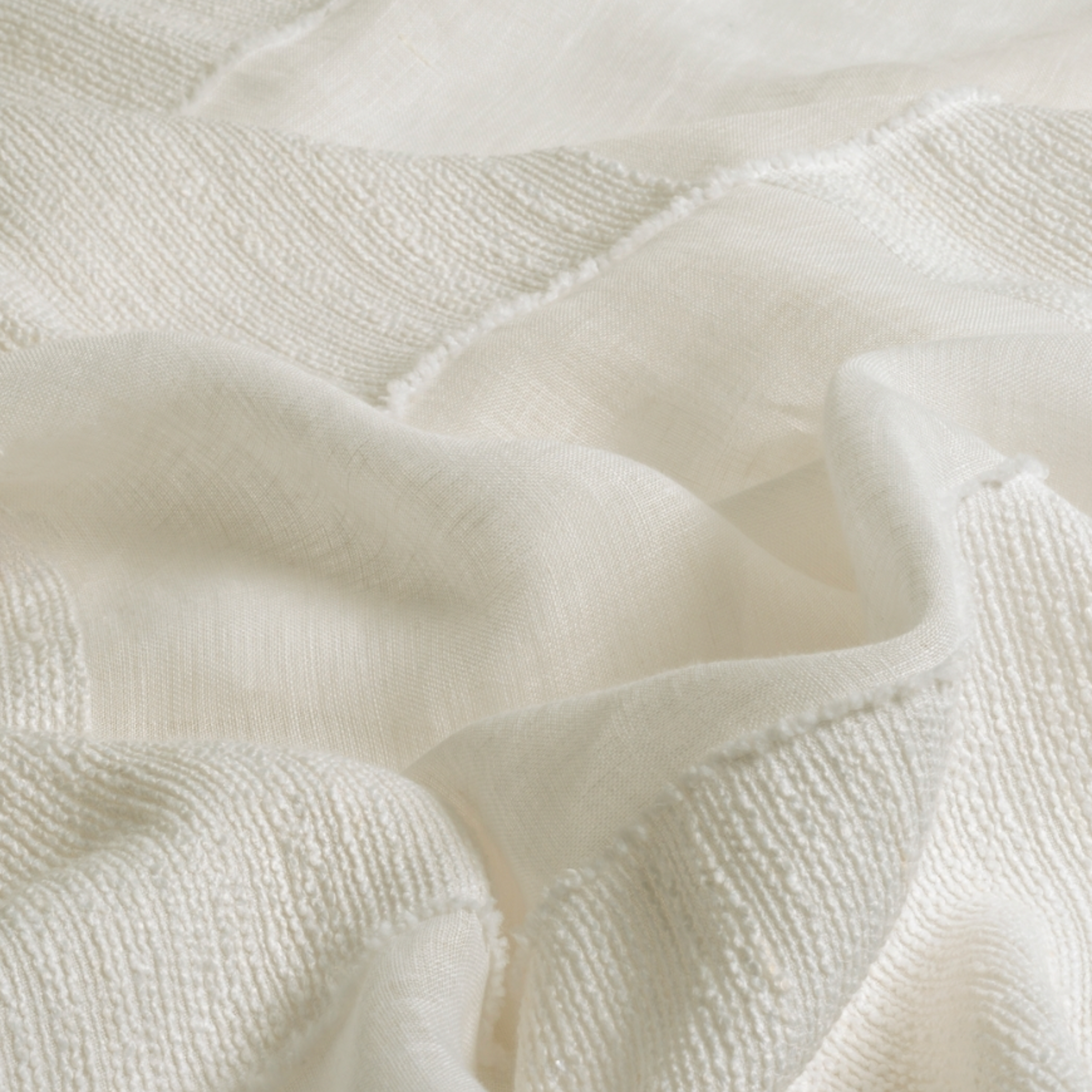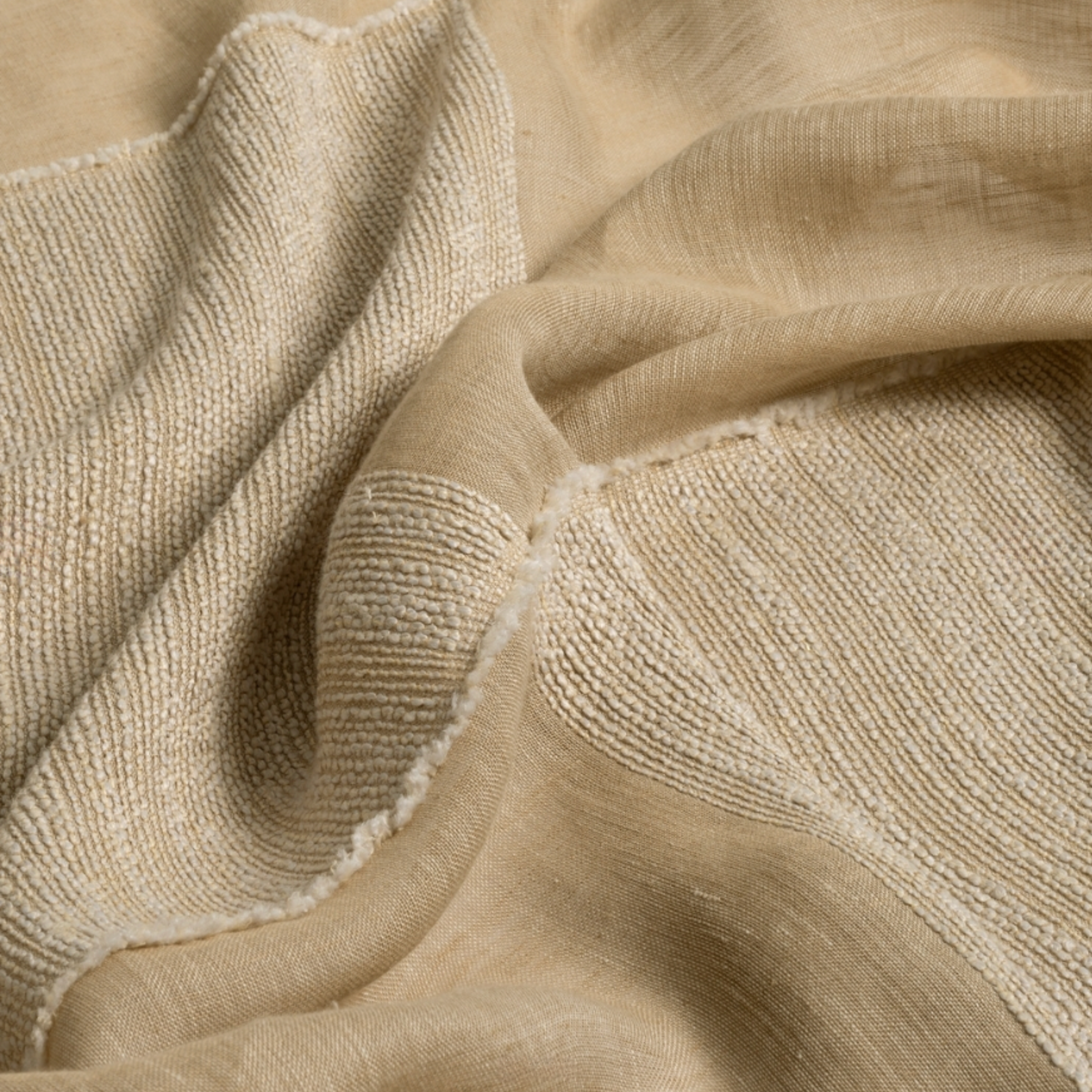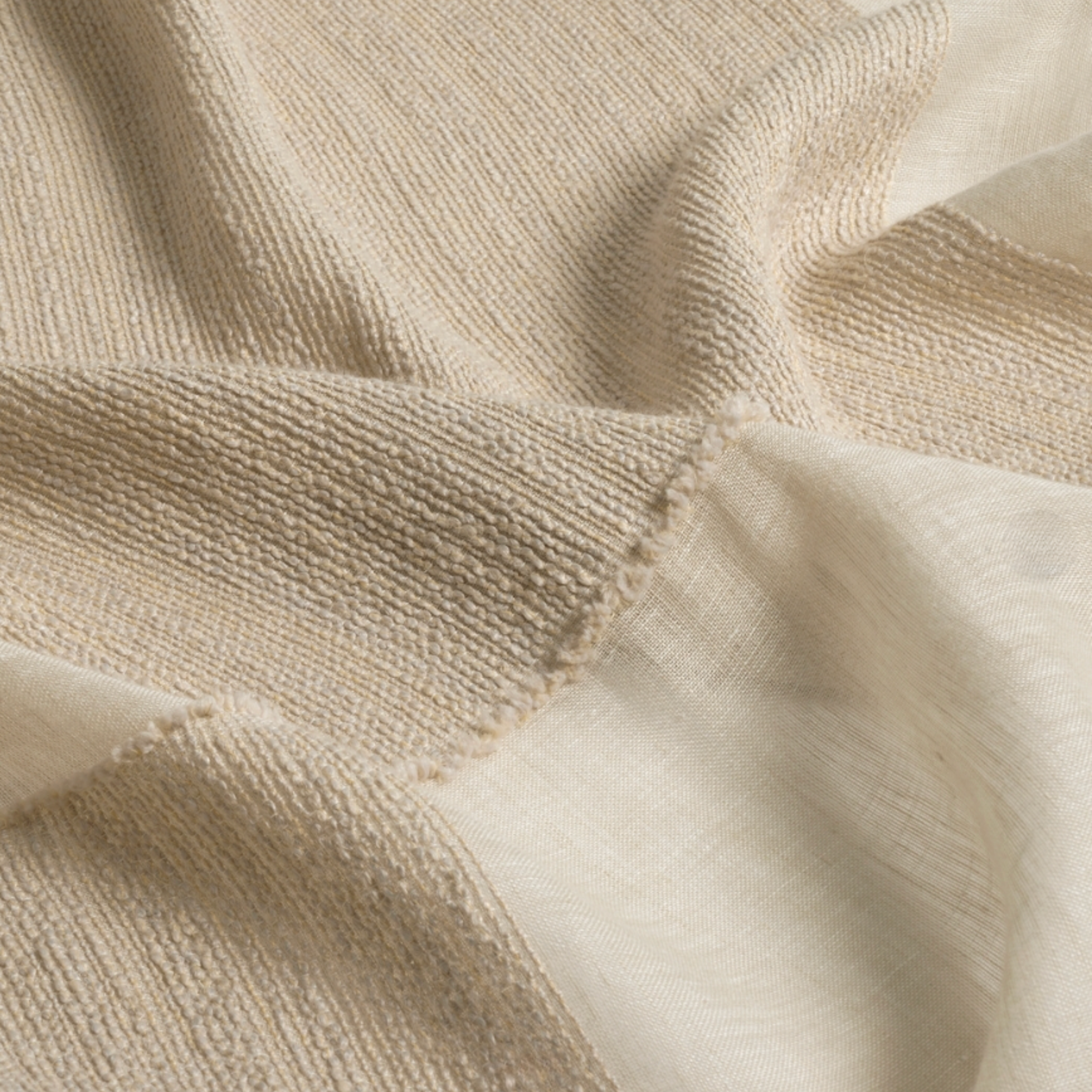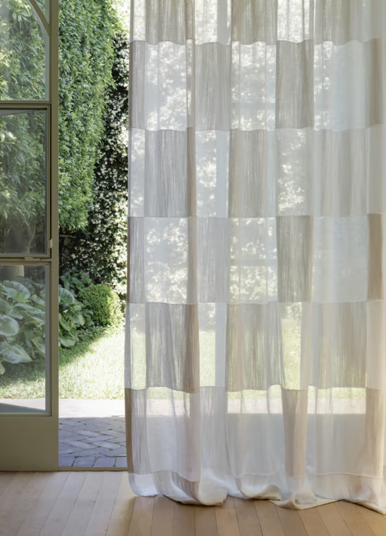 An elementary large check is enhanced by transparency, tactile yarn, and a sublimely soft drape. The fil coupe weave technique, ‘fil’ meaning the weft yarn and ‘coupe’ meaning cut, was the perfect solution to create this translucent and textural geometric sheer. The clipped yarns are brought to the face of the sheer to add further dimension and energy to the finished design. Quadrata is constructed in three naturalistic shades: Ivory, Bone, and Tussah.